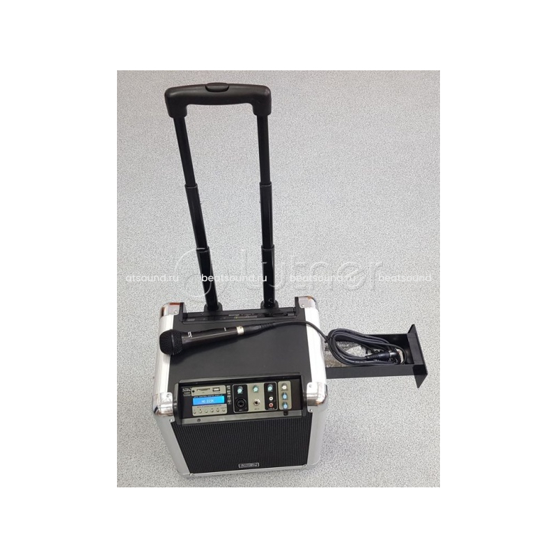 Портативная акустическая система с аккумуляторм и проводным мирофоном.