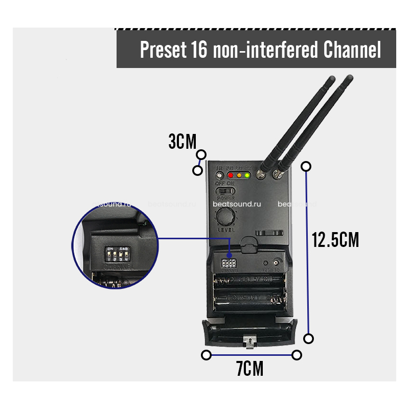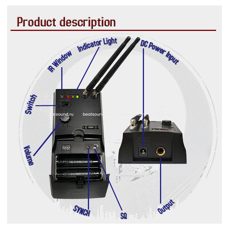 Синхронизация частот приемника и передатчика производится через ИК-порт, единовременно на одной площадке может работать до 16 радиосистем. Сканирование радиоэфира на предмет свободных частот производится посредством приемника.