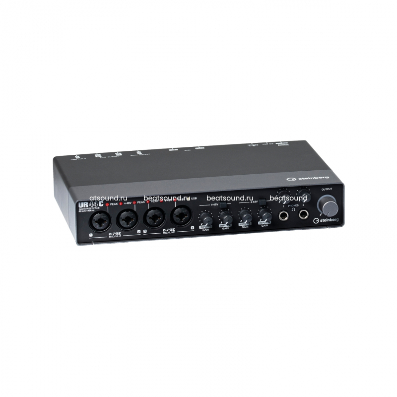 Все элементы управления картой остались на месте, из изменений можно отметить только более крупный общий регулятор усиления, дополнительно получивший подсветку. UR44C оснащен 4 предусилителями Yamaha D-PRE А класса c усилением до 60 дБ, 4 регуляторами усиления каналов, общим регулятором громкости, 2 отдельными регуляторами для наушников, 2 переключателями фантомного питания и светодиодными индикаторами.