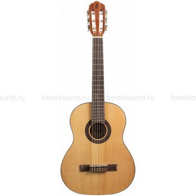 Верхняя дека изготовлена из ели, что обеспечивает чистое звучание, так необходимое для грамотного развития слуха. Нижняя дека и обечайки из сапеле, породы дерева по свойствам очень схожим с красным деревом, благодаря чему звук приобретает мягкость и глубину. Достаточно толстая, порядка 6 мм, палисандровая накладка на грифе создает в руке ощущение приятной весомости и надежности.