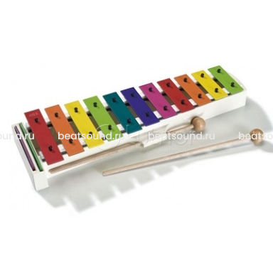 Глокеншпиль с металлическими пластинами разных цветов. Пластиковый корпус со сглаженными углами и держателем палочек.