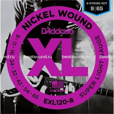 EXL120-8 Nickel Wound Комплект струн для 8-струнной электрогитары, Super Light, 9-65, D'Addario