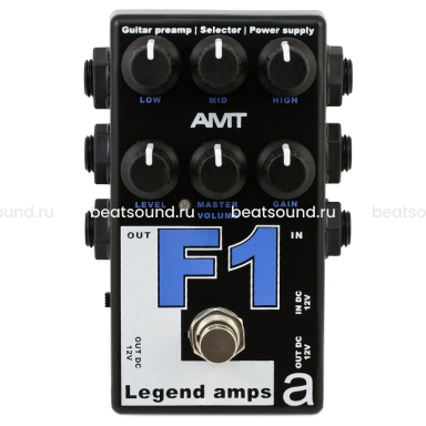 AMT Electronics F1 (как и V1) поставляется с сетевым адаптером на 12В (в отличии от других преампов этой серии) и имеет встроенный разветвитель на 3 разъёма для подключения внешних гитарных эффектов или преампов LA серии, питающихся от 12В.