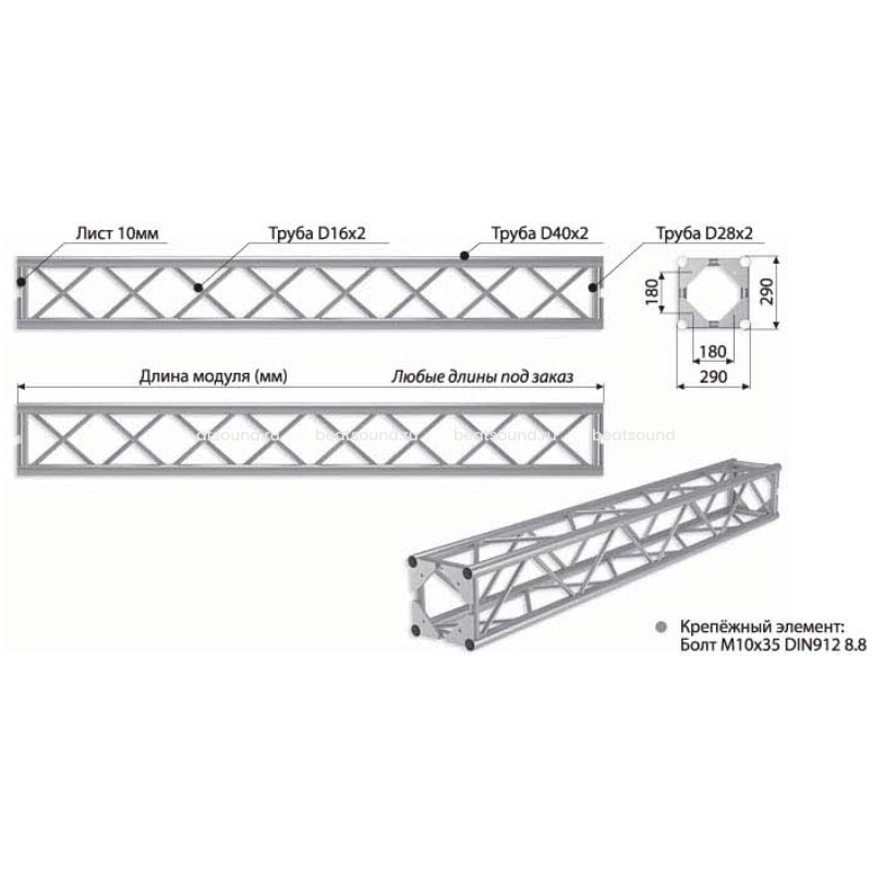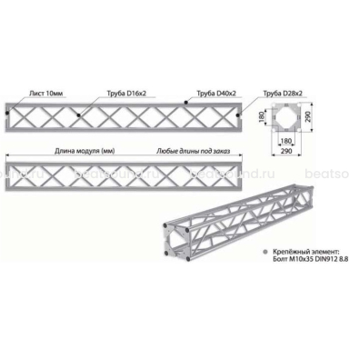 Прямой модуль квадратной конфигурации длиной 500мм, 290x290мм, d40x2 \ d16x2мм. Крепежный размер 180х180мм, М10. Рисунок перемычек круговой. Читать подробнее